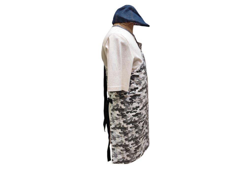 Pánská zástěra je zhotovená z maskáčové látky. Popruhy jsou černé, zhotovené ze směsi bavlny a polyesteru.